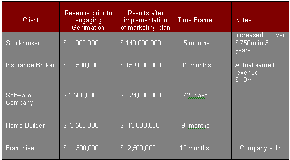 | This is a sampling of the results produced for clients that deployed their Genimation Marketing Plan using the Genimation process to develop their Genimation Marketing Plan. The Genimation Group takes an extraordinary amount of pride and ownership in our approaches to developing marketing programs for our clients…meaning we like to develop extremely unique and extraordinary plans and we like to measure results. We realize that even though you may intellectually understand the value of our services, it’s the bottom line that counts. It is also the primary reason we ask for pertinent financial information because the primary goal of our work, is to not only generate new sales…but to increase your company’s profitability. Our primary focus of The Genimation Program is to build a customized marketing plan to meet your specific objectives and goals thus no one single Genimation is ever alike in complexity, content and design.